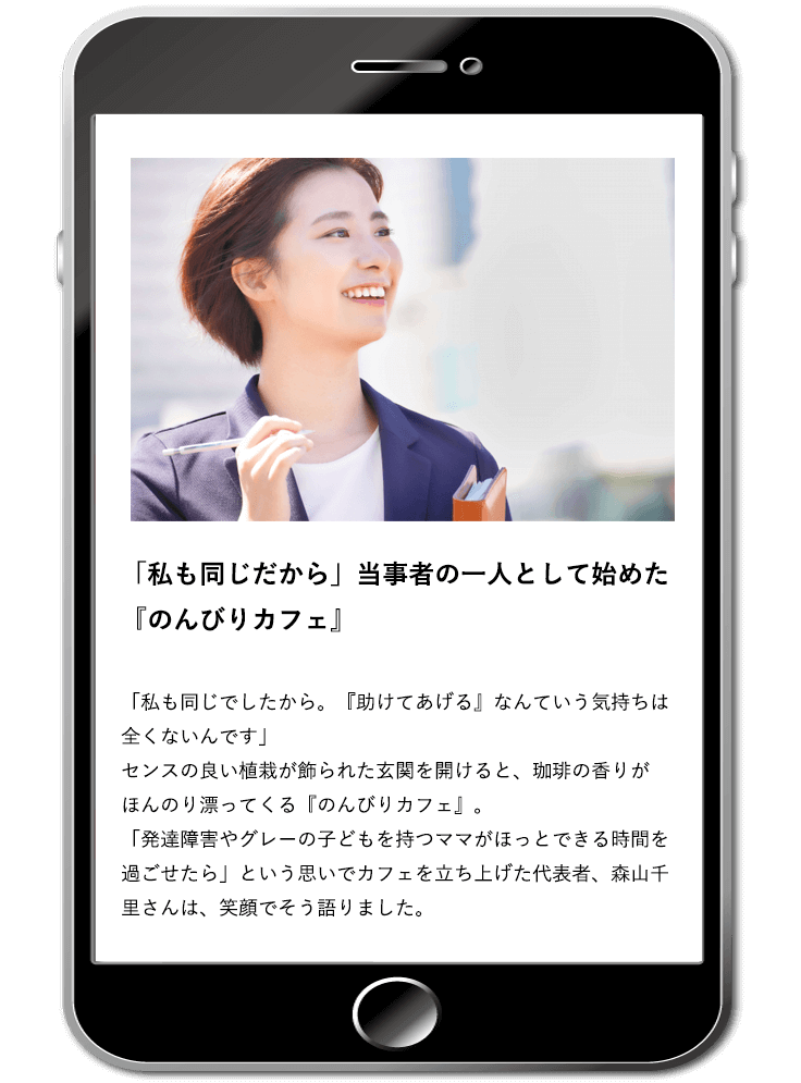 記事と写真を通して、代表者の素顔や活動に込める思い、活動の様子などを知ることができます。活動の認知拡大と共に、当事者が団体に連絡し、つながりを持つきっかけづくりを目指します。