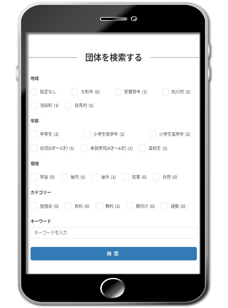 対象年齢や活動内容・地域といった条件を設定して、安曇野・大北地域の団体情報・イベントを絞り込み検索できます。